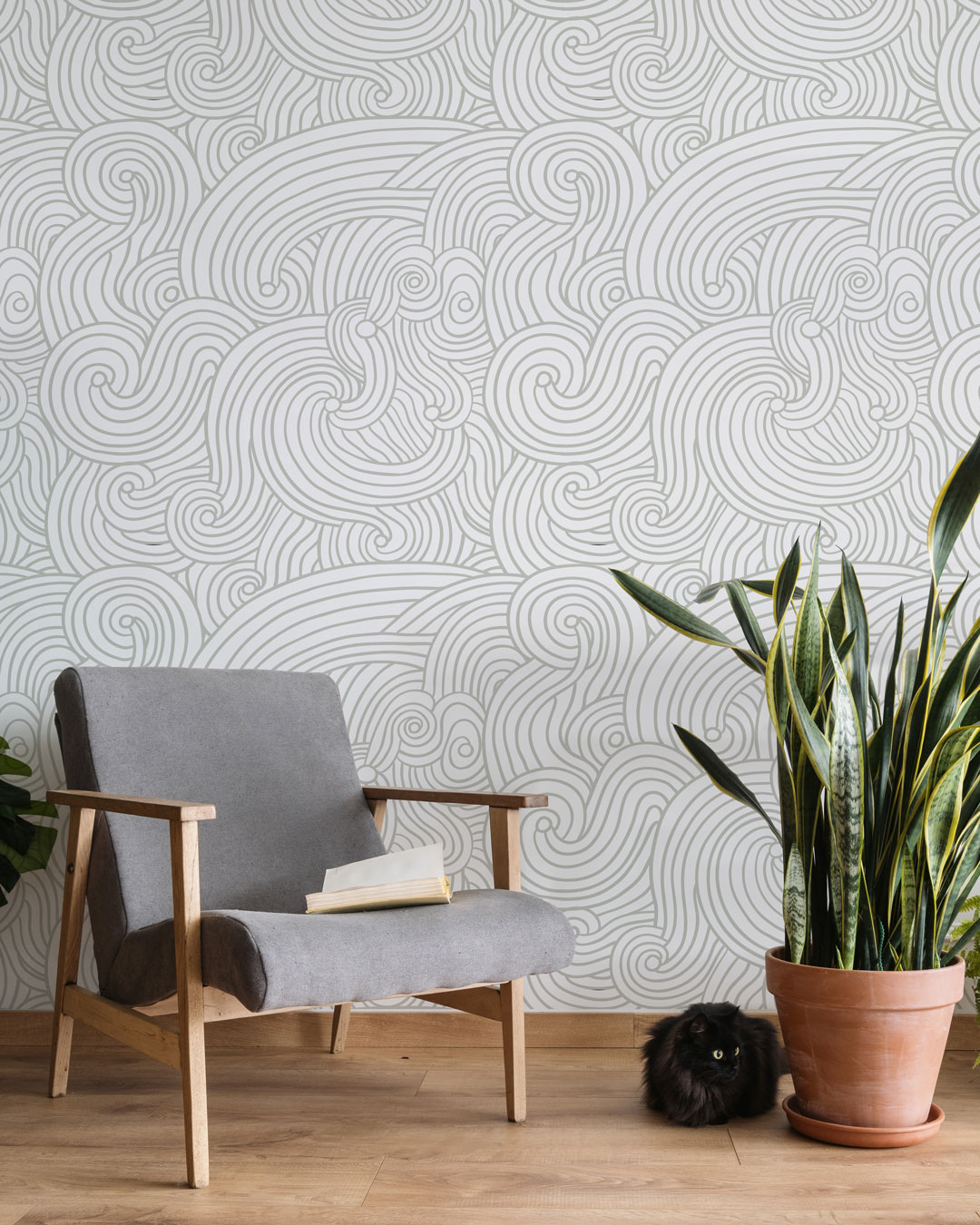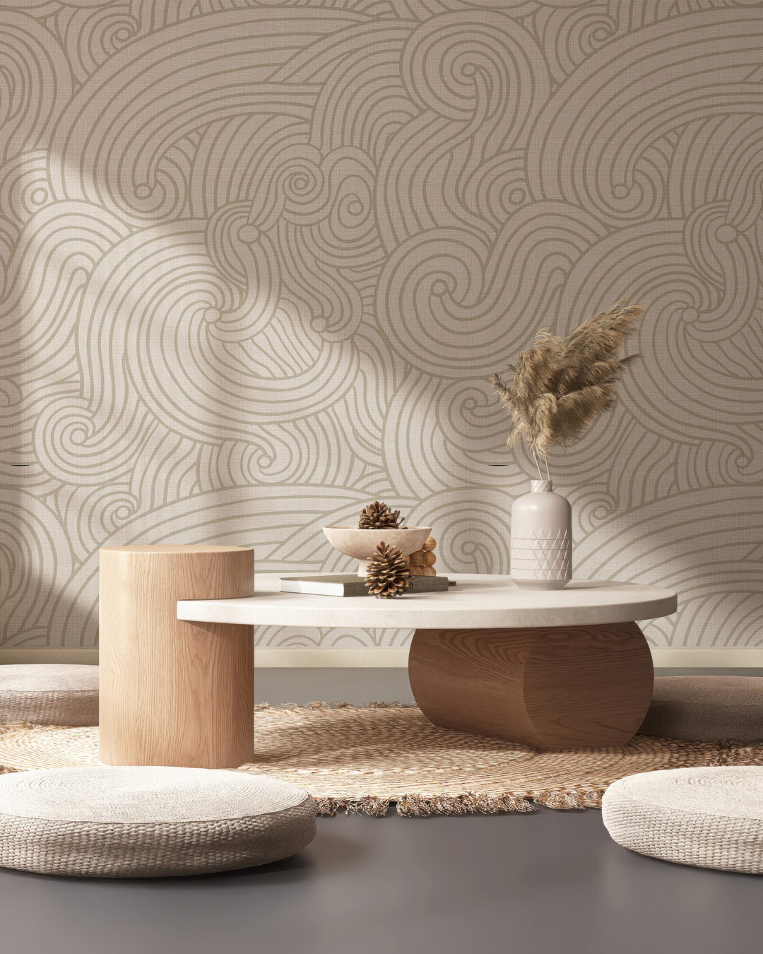 Associé à des meubles en bois clair ou foncé, le papier peint gagne en chaleur et en authenticité. Les tons organiques du bois se marient parfaitement avec le graphisme fluide du motif, créant un équilibre entre naturel et modernité. Les fibres comme le rotin, le bambou ou le lin viennent renforcer cette atmosphère douce et accueillante.