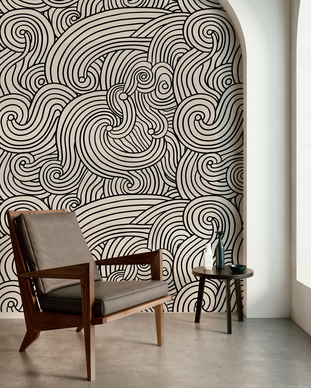 Le papier peint entrelacs offre un design original et apaisant grâce à ses courbes élégantes. Il s’associe facilement avec des matériaux naturels ou modernes pour une déco unique. Disponible en beige, gris, noir et bleu.