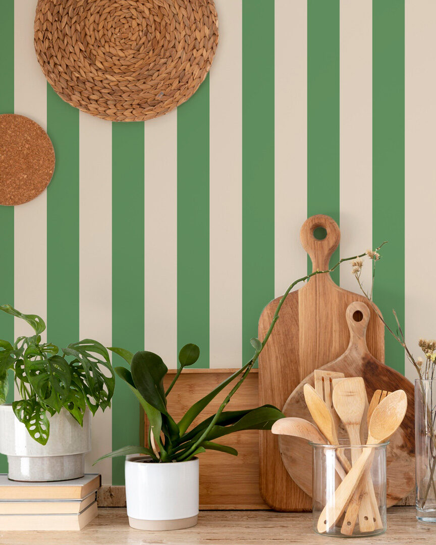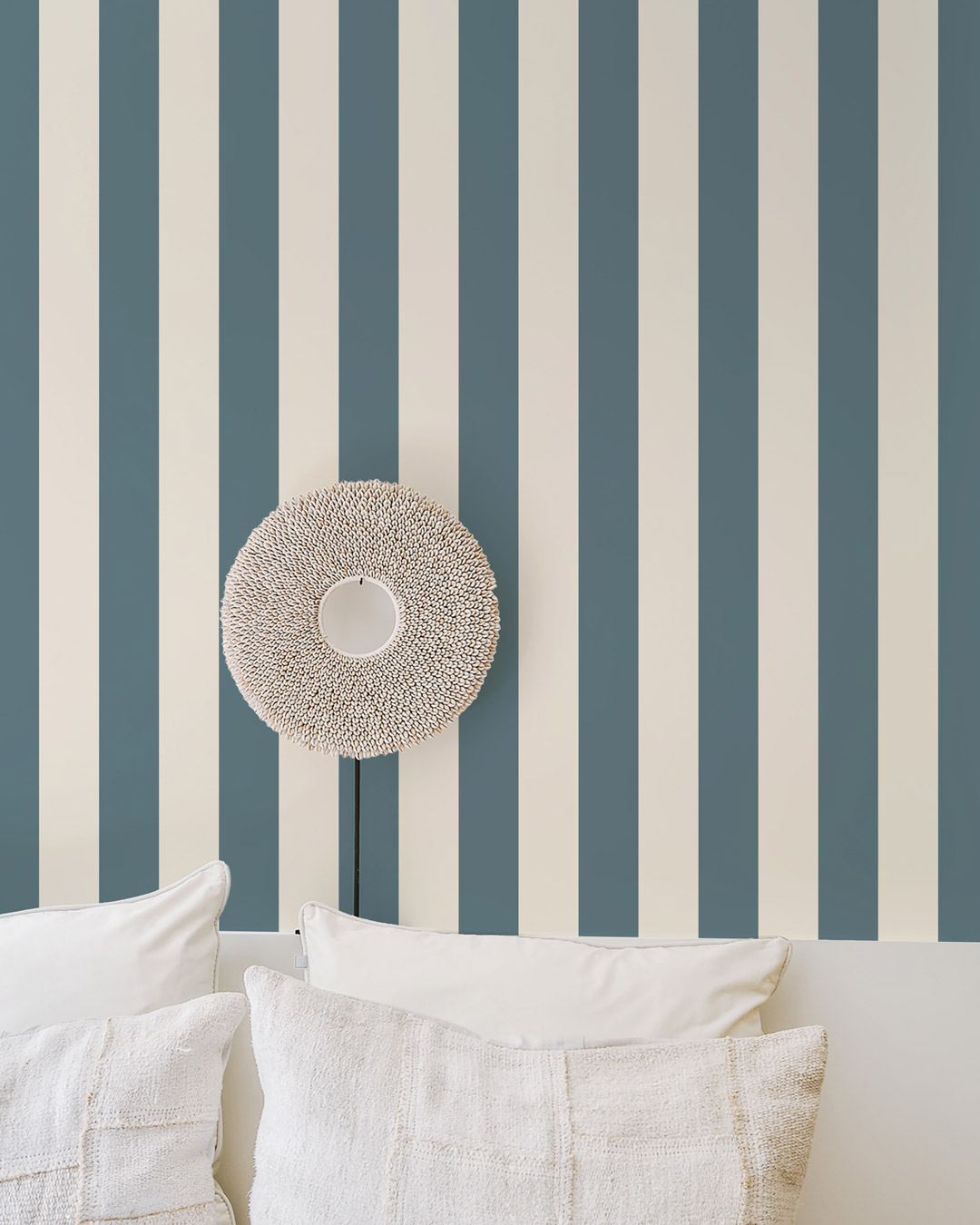 Dans une chambre, les rayures larges apportent du caractère sans surcharger la décoration. Elles sont parfaites pour habiller un mur derrière un lit et créer une tête de lit élégante. Associez-les à du linge de lit uni et à des meubles aux tons neutres pour un rendu harmonieux.