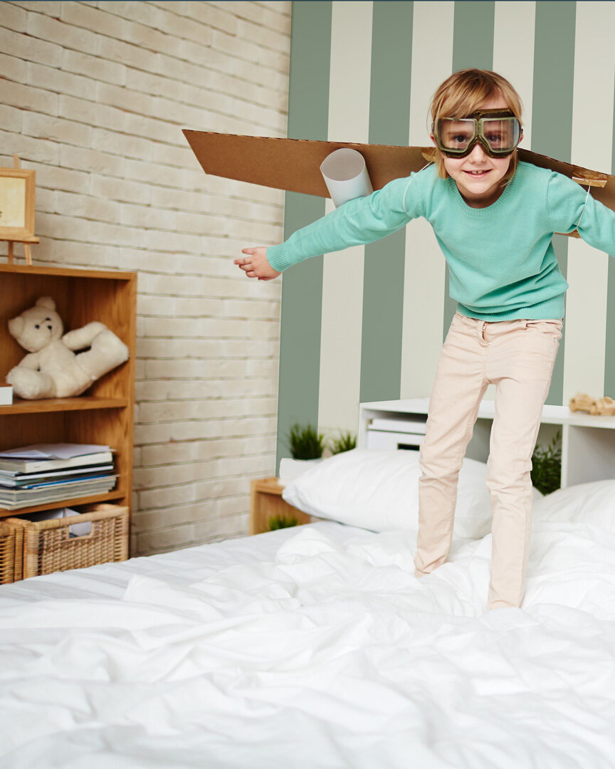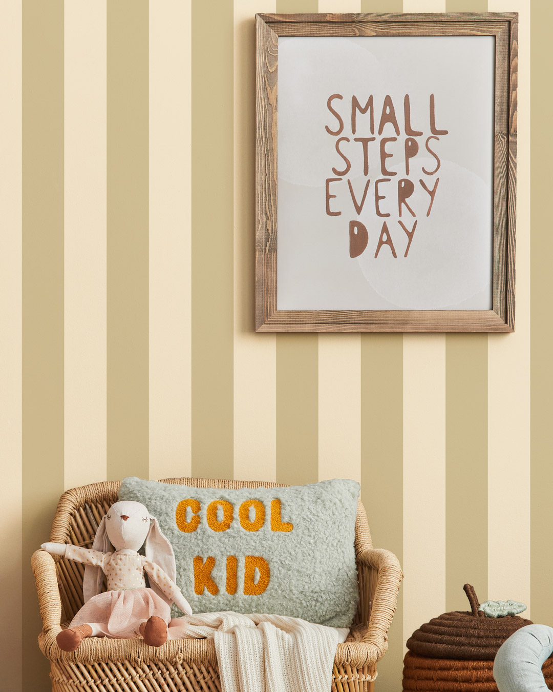 Le papier peint rayures larges est idéale pour une chambre d’enfant, en particulier dans des teintes pastel comme le bleu ou le rose. Elles apportent une touche ludique et peuvent être associées à des meubles en bois clair et à des accessoires en rotin pour une déco douce et chaleureuse. Et pour les Beige Mum, nous avons aussi pensé à la version 100% beige !