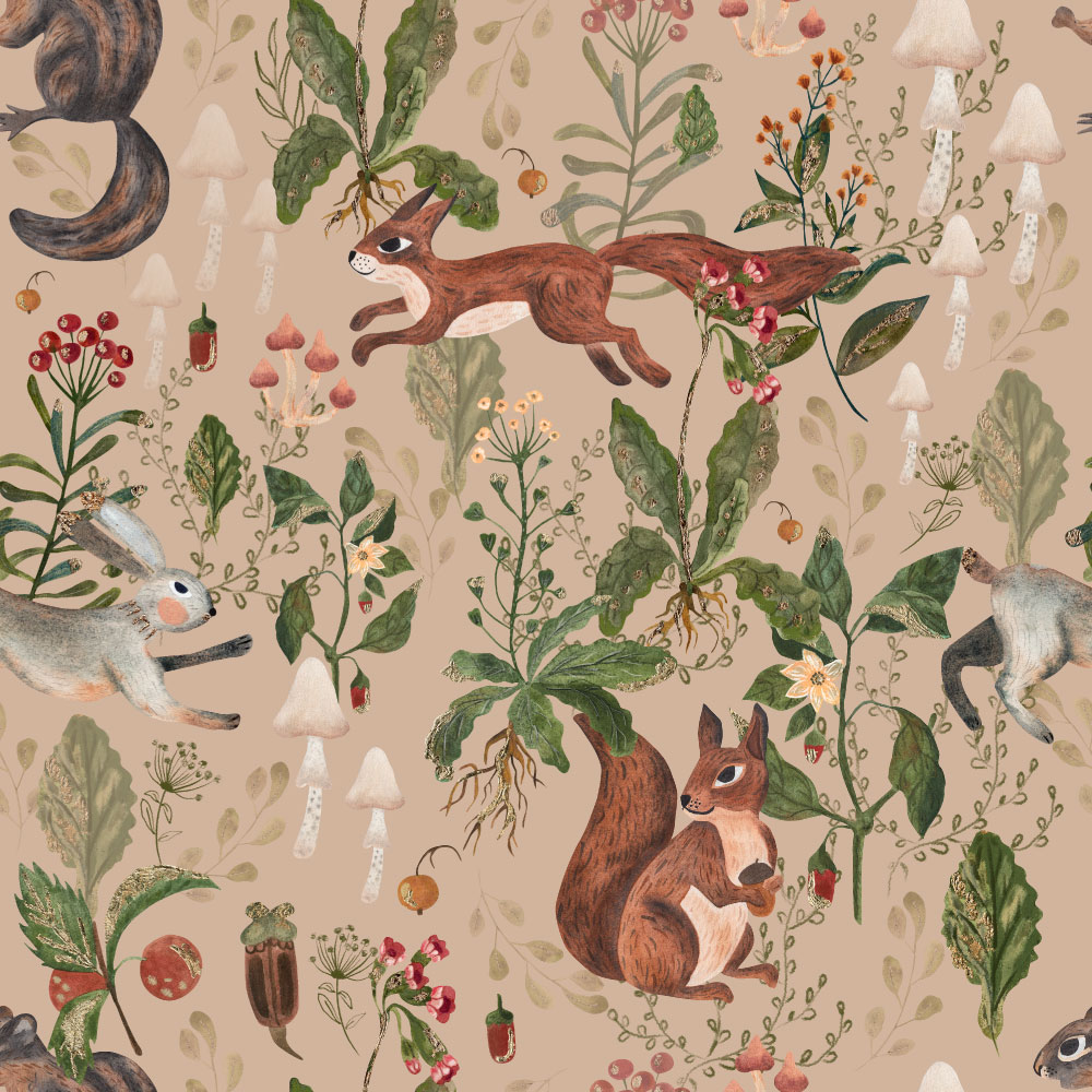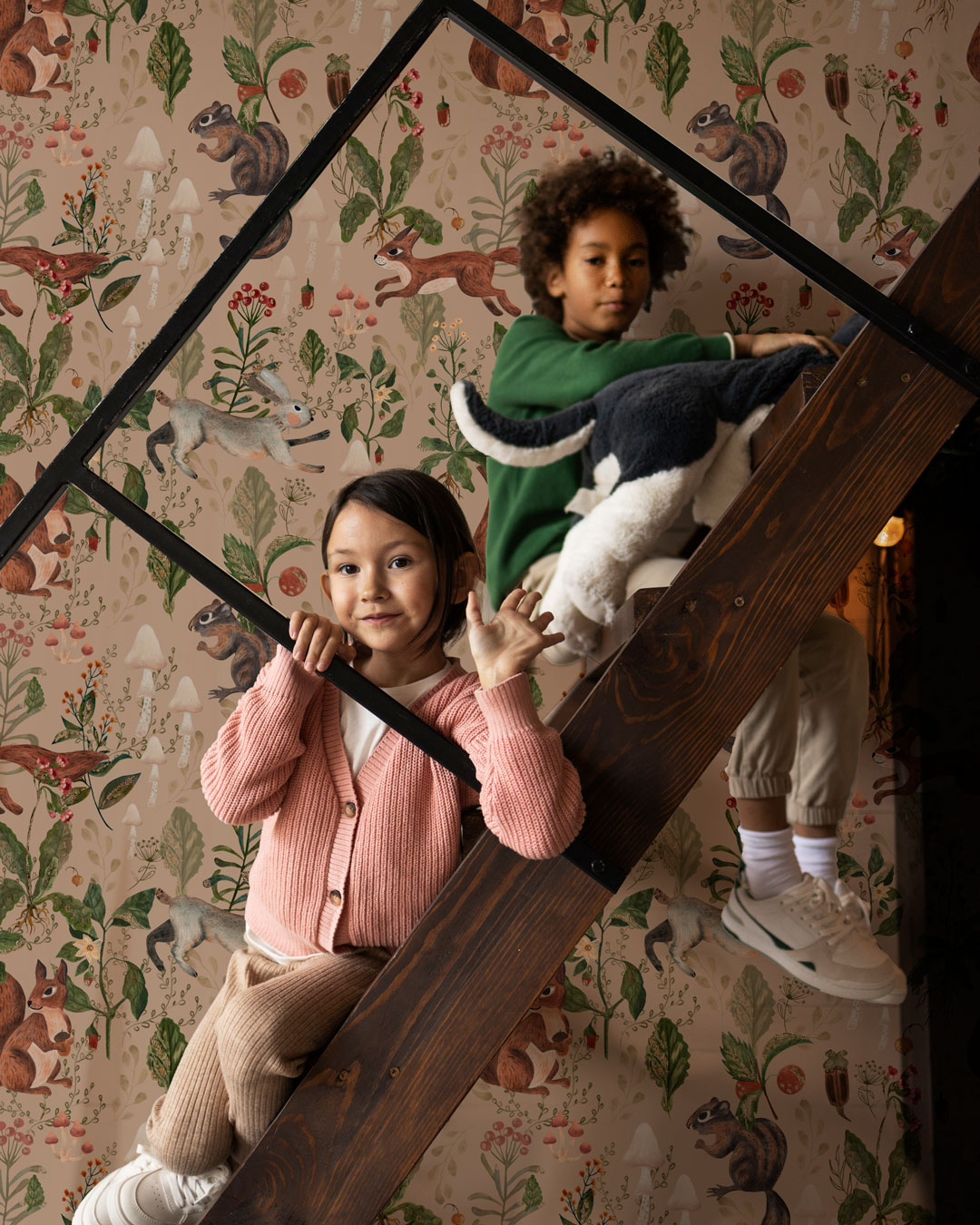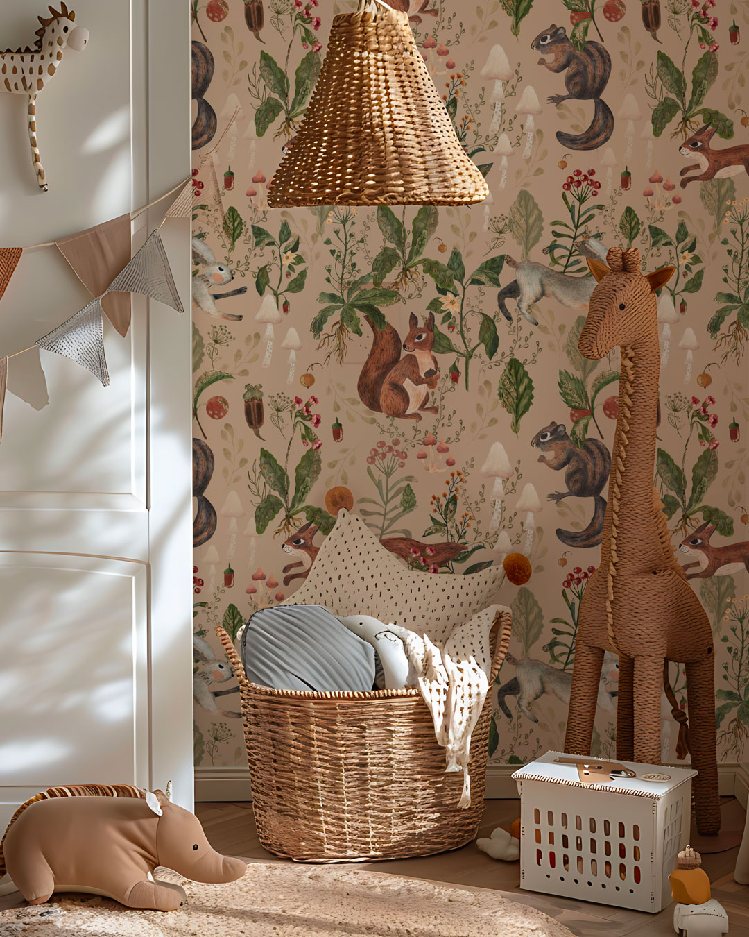 Le papier peint animaux aquarelle enfant transporte les petits dans une forêt enchantée. Entre écureuils curieux, renards et plantes délicates, ce décor chaleureux et naturaliste aux tons naturels crée une atmosphère apaisante et rêveuse, parfaite pour une chambre d’enfant.