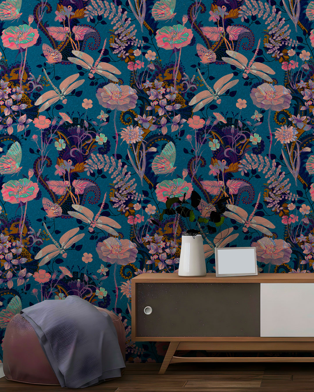 Ce papier peint libellule et papillon n’est pas un simple motif décoratif. Il agit comme un élément central dans une pièce, apportant une véritable identité à votre intérieur. En un seul pan de mur, il peut métamorphoser l’atmosphère et faire entrer un souffle de poésie et de nature dans la maison. Son univers visuel abondant, plein de détails, attire le regard et stimule l’imaginaire, tout en restant suffisamment harmonieuse pour ne jamais étouffer l’espace. Ce décor convient aussi bien à un style éclectique, bohème, romantique ou artistique, qu’à un univers plus épuré cherchant une touche forte pour équilibrer la sobriété.