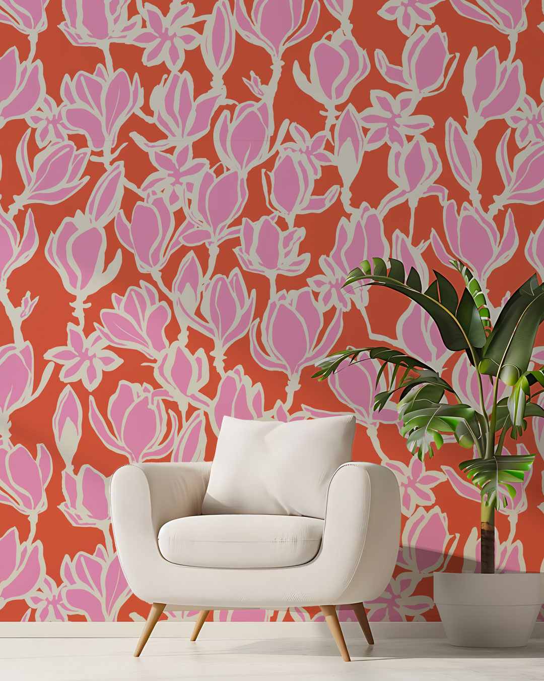 Ce mariage entre tradition florale et design contemporain donne naissance à une décoration murale élégante, qui se distingue aussi bien dans un salon moderne que dans une salle à manger chic. Le magnolia, plante synonyme de renouveau et de raffinement, s’exprime ici dans toute sa puissance décorative. Découvrir notre collection de papier peint fleuri.