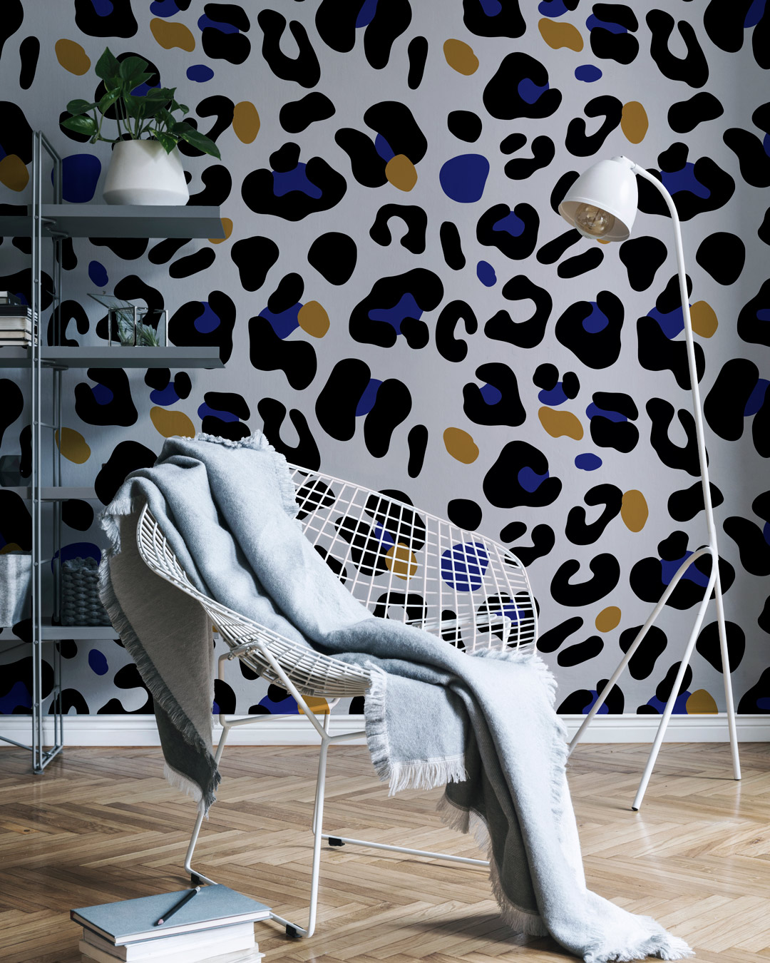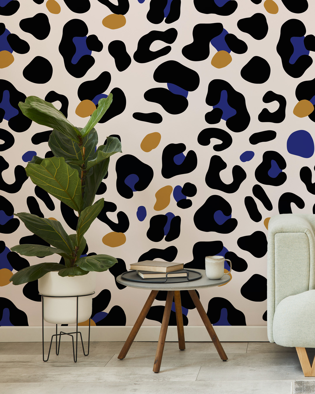 Dans une chambre, posez ce papier peint motif léopard moderne en tête de lit pour un effet galerie d’art audacieux.