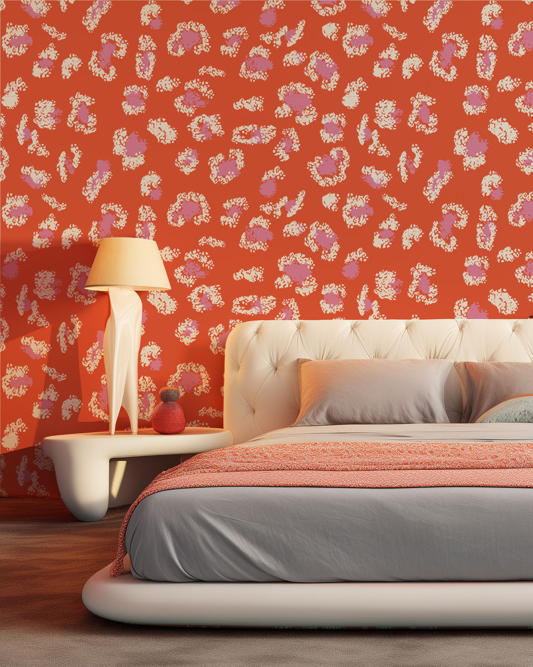 Cette tapisserie originale attire le regard sans jamais saturer l’espace. Sa palette chaude, dominée par des tons orangés, rosés et blancs, illumine la pièce tout en créant une ambiance conviviale et moderne. Le papier peint léopard moucheté devient ainsi un véritable parti pris décoratif : il habille le mur comme une œuvre d’art.