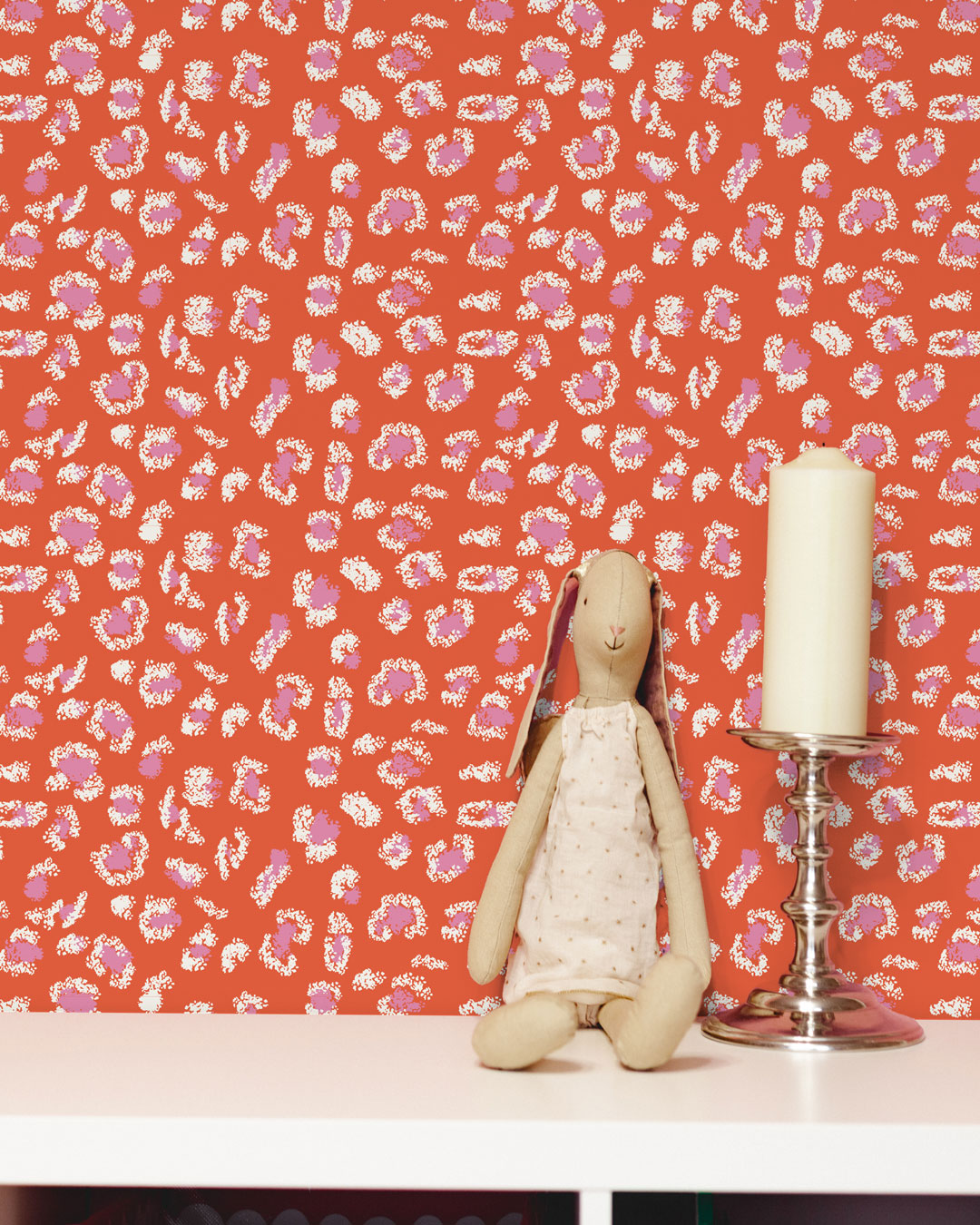 Ce papier peint séduit avant tout par sa vitalité. Le fond orangé, solaire et affirmé, fait écho à une énergie joyeuse : il réveille un mur comme une tasse d’espresso au petit matin. Les touches de rose et de blanc viennent équilibrer cette intensité, apportant douceur et fraîcheur à l’ensemble.