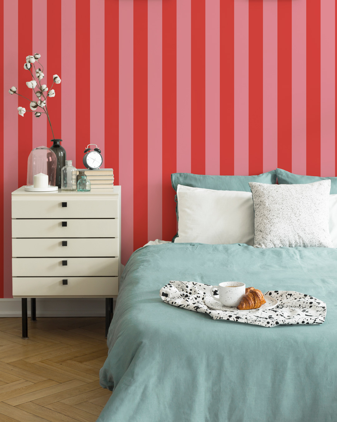 Même si le papier peint rayures flashy rose possède une forte présence, son motif reste simple dans sa structure. Les rayures verticales permettent de l’associer facilement à :