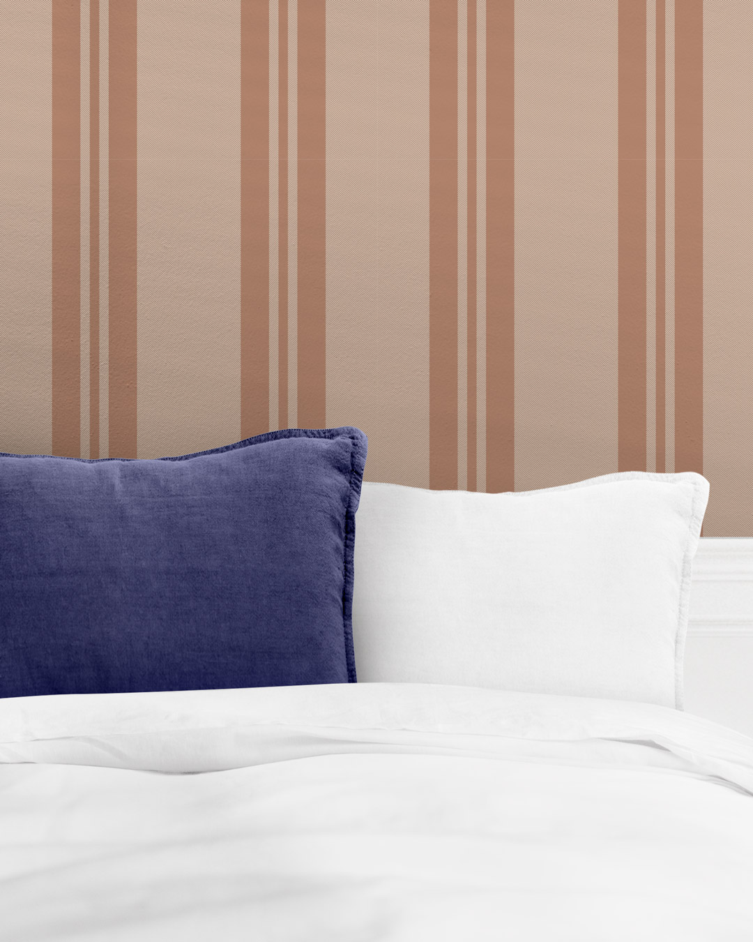 Dans une chambre : Les teintes douces procurent une atmosphère propice au repos. Il peut être posé sur un pan de mur derrière le lit pour créer une tête de lit graphique subtile et naturelle.