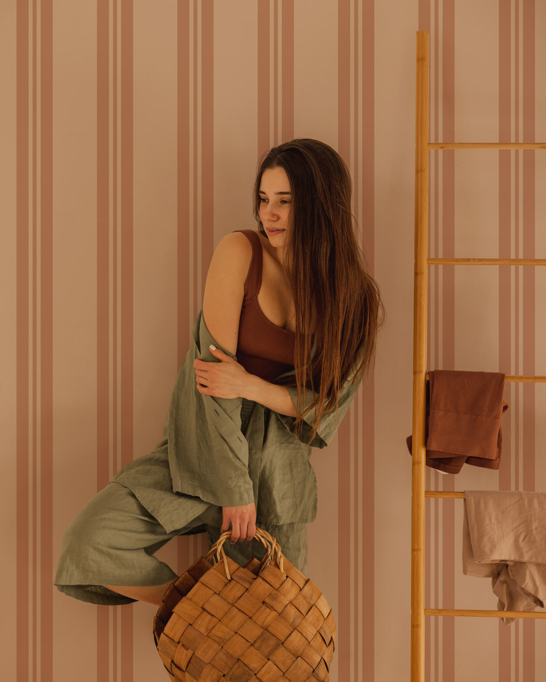 Dans une entrée ou un couloir : Placer ce papier peint dans une entrée permet d’offrir un accueil chaleureux dès le premier regard. Les rayures verticales allongent visuellement l’espace, idéal pour des zones de passage souvent plus étroites.