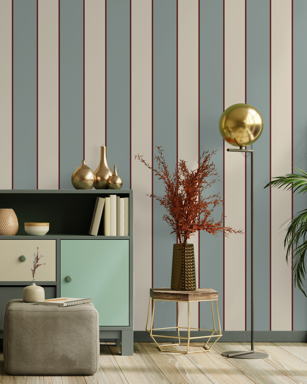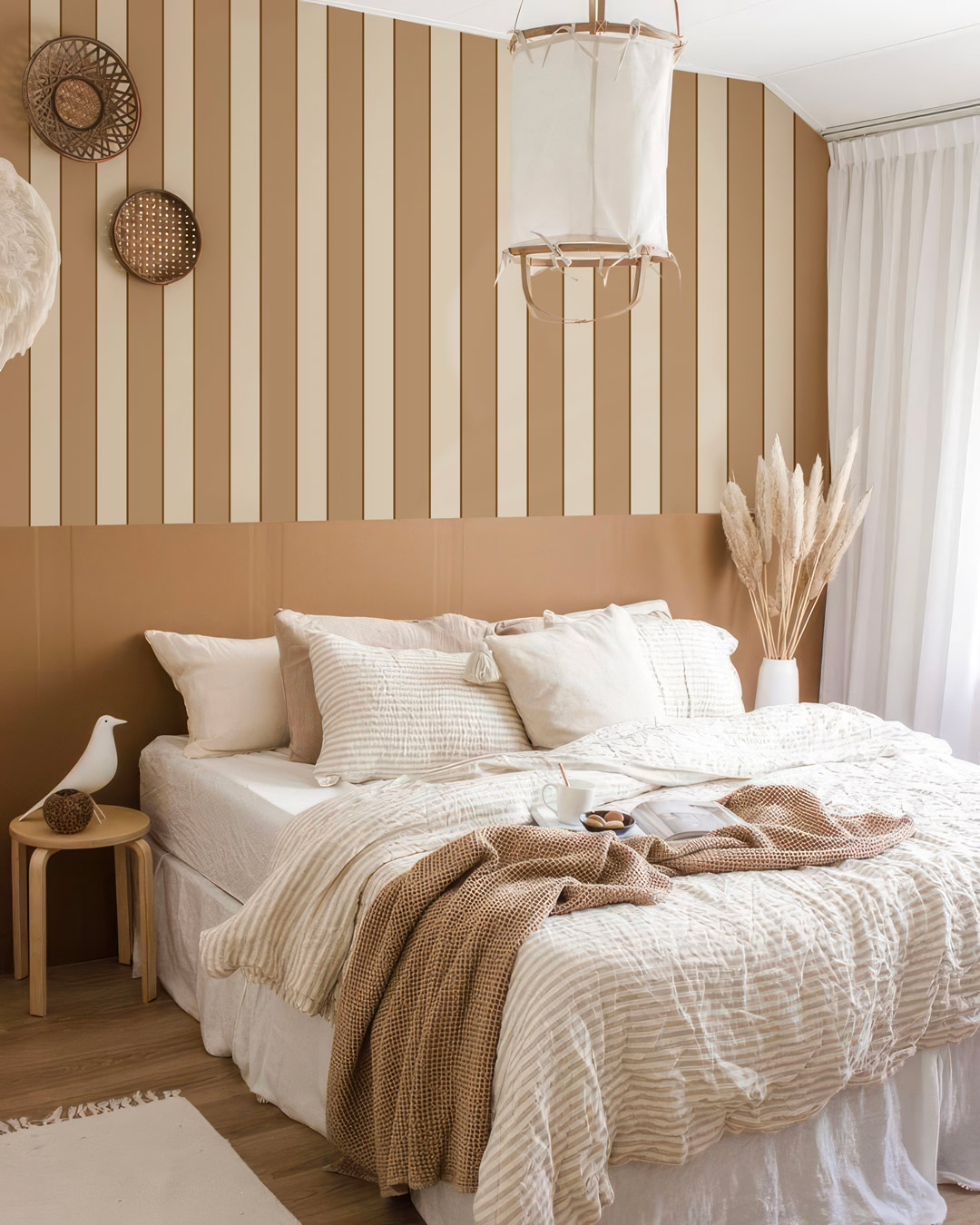 Les rayures verticales allongent visuellement le mur et donnent plus de structure à la pièce. Cela fonctionne particulièrement bien dans les espaces qui manquent de hauteur ou qui ont besoin d’un repère visuel fort pour être mieux organisés.