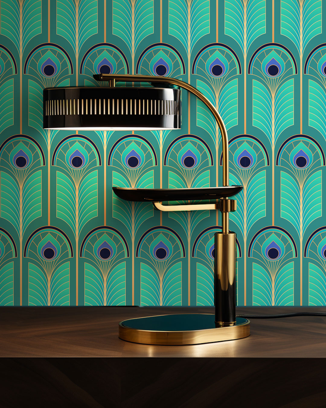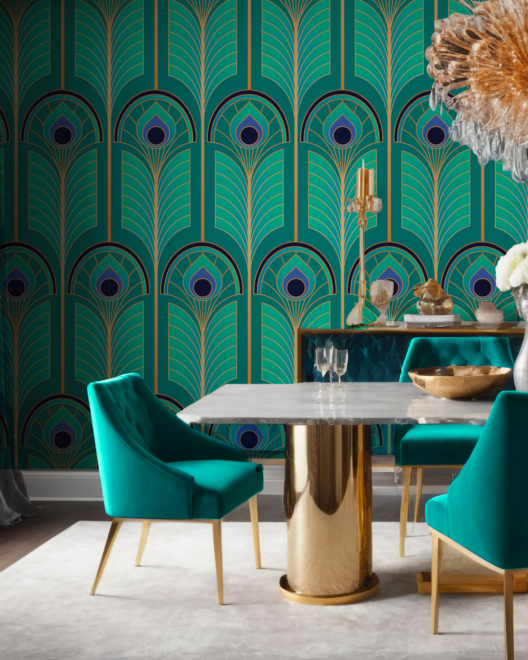 Le motif s’inspire du plumage de paon, mais en le simplifiant et en le structurant selon les codes du design Art Déco. Les courbes, les arcs et les symétries créent une répétition graphique qui attire le regard sans jamais l’étouffer. Ce n’est pas un papier peint figuratif mais une réinterprétation élégante, propice aux intérieurs modernes comme aux espaces plus classiques cherchant une touche audacieuse.