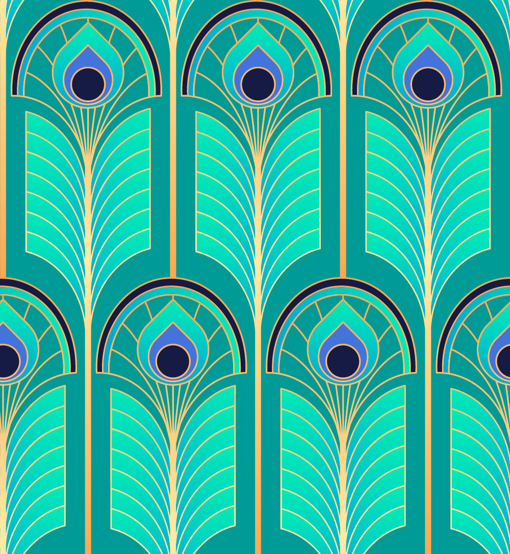 Le papier peint art déco dégradé turquoise se distingue par sa construction visuelle inspirée des plumes de paon stylisées, emblèmes historiques de l’élégance et du raffinement. Le motif reprend les codes majeurs de l’Art Déco : symétrie, géométrie structurée, jeux de lignes et contrastes subtils entre teintes franches. Ici, le dégradé de turquoise s’entrelace avec des touches de bleu profond, de vert émeraude et de nuances dorées, créant un ensemble à la fois captivant et sophistiqué.
