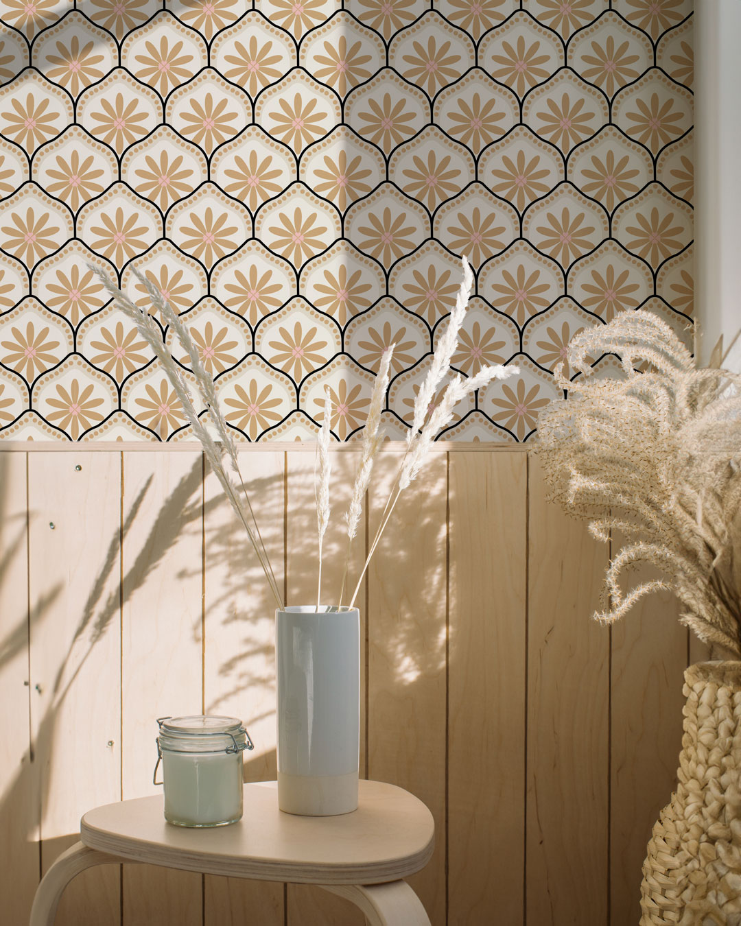 Ce papier peint séduit par sa capacité à mêler ordre et créativité : la répétition des formes florales s’harmonise avec la rigueur géométrique typique du mouvement art déco. Le résultat est un décor élégant, vivant et rythmé, idéal pour donner du caractère à un mur de salon, une entrée ou une chambre.
