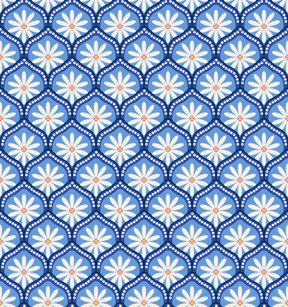 L’équilibre visuel du papier peint marguerite art déco repose sur un motif répétitif qui évoque à la fois la nature et l’art graphique. Les marguerites stylisées s’inscrivent dans un réseau de formes géométriques bleues et blanches, dessinant un ensemble régulier qui inspire sérénité et raffinement.