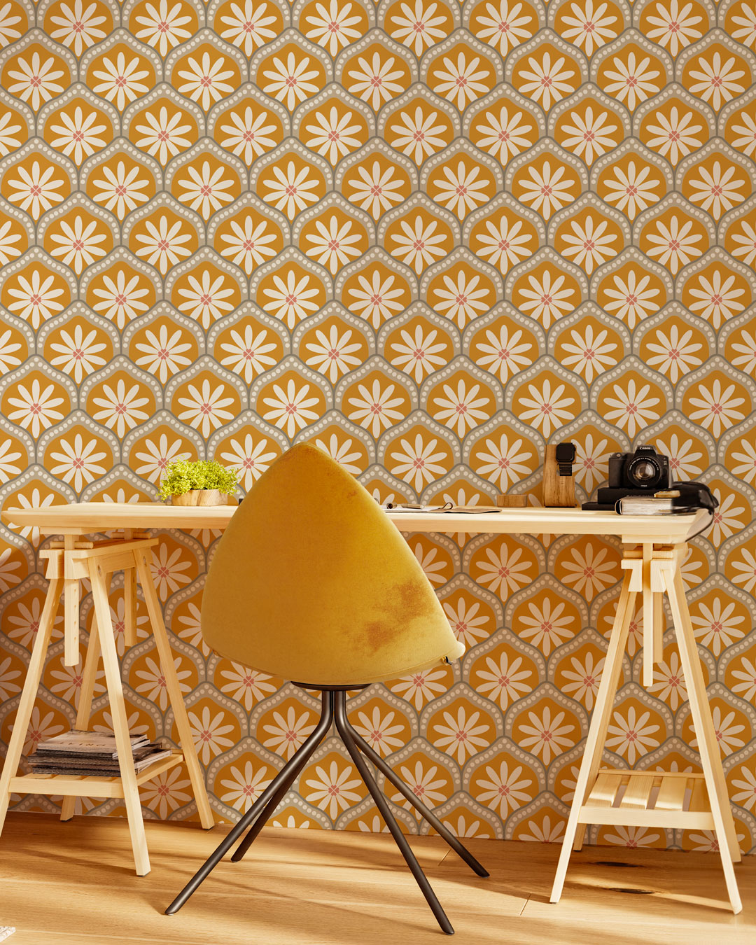 Le papier peint marguerite art déco revisite le style des années 20 avec un motif floral structuré et raffiné. Ses marguerites stylisées créent un jeu géométrique équilibré et apaisant. Parfait dans un salon ou une chambre, il s’accorde avec des matières naturelles et des tons chauds pour un rendu harmonieux et créatif. Disponible en beige, bleu et orange.
