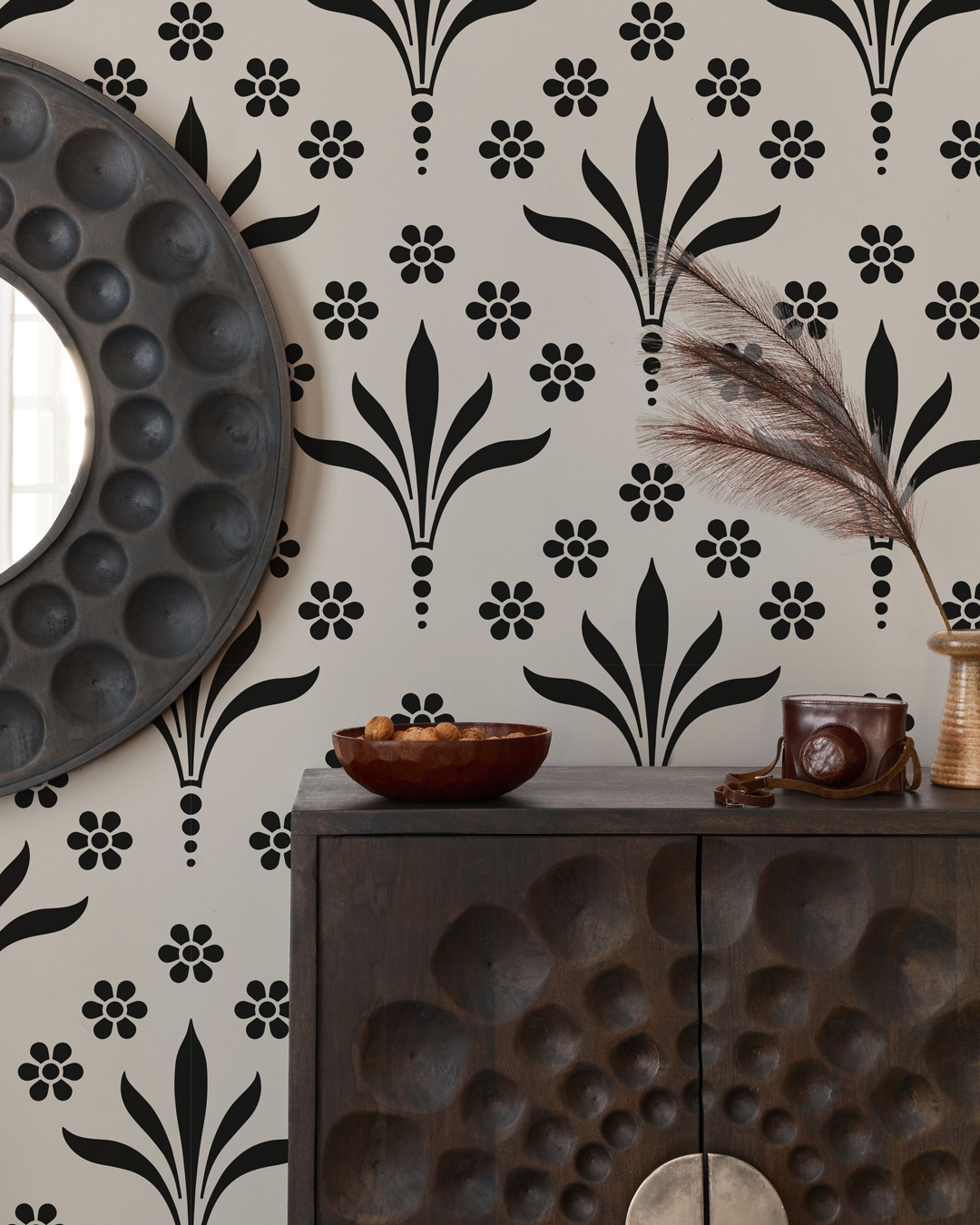 Le maximalisme proposé ici n’est pas saturé ni envahissant : il repose sur la répétition d’un motif floral fort, mais parfaitement organisé. L’effet décoratif se construit dans la cohérence des lignes et dans le contraste expressif du noir sur fond neutre. Le mur devient un élément architectural, une sorte de fresque moderne capable de transformer une pièce sans l’alourdir.