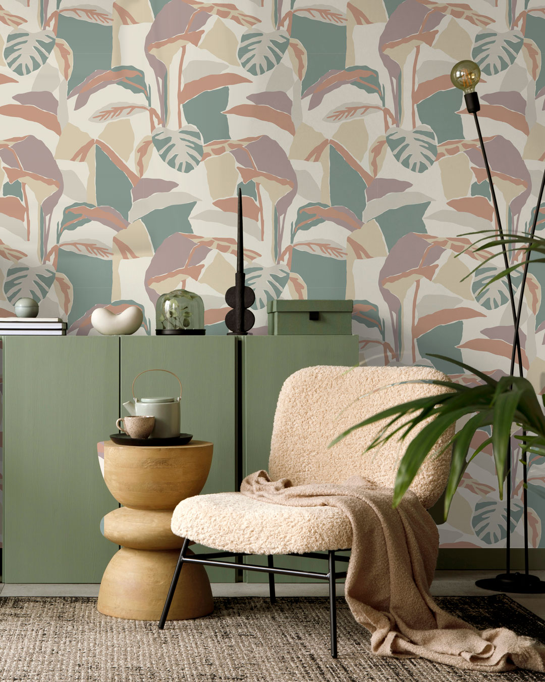 Pour accompagner cette tapisserie feuillage abstrait, privilégiez des accessoires et matériaux naturels ou doux afin de prolonger l’atmosphère feutrée :