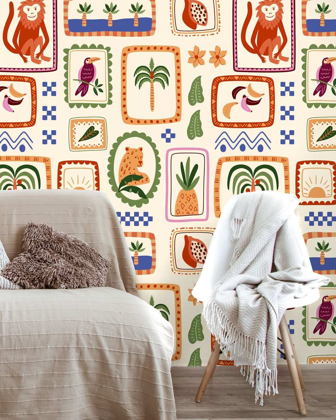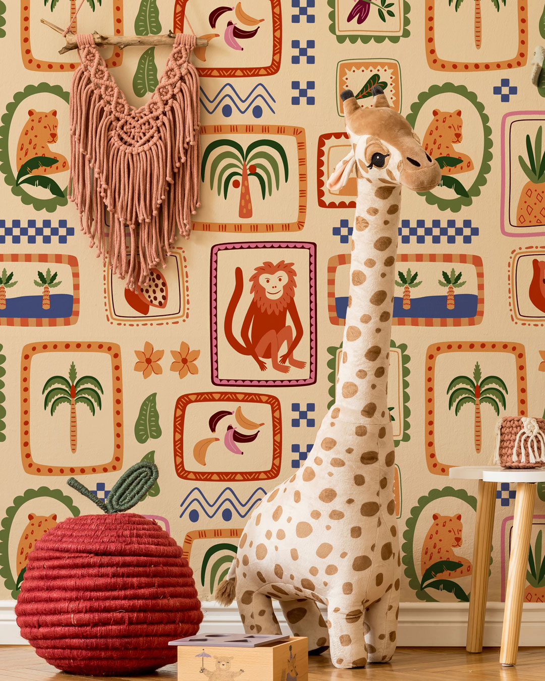Dans une chambre, ce type de décor invite les enfants à inventer leurs propres histoires : chaque cadre devient une scène, chaque motif un personnage. On passe du dessin d’un singe joueur à un palmier coloré ou à une frise géométrique, comme une galerie miniature dédiée à l’aventure et à la bonne humeur. Plus d’inspi dans notre catégorie de papier peint safari.