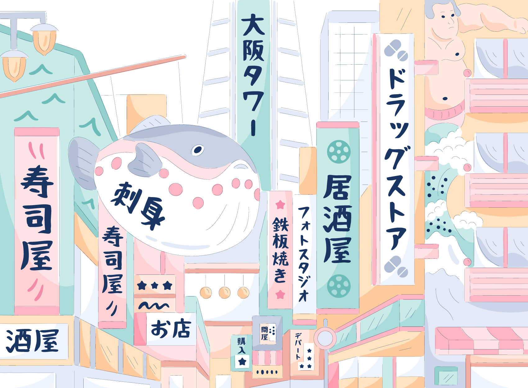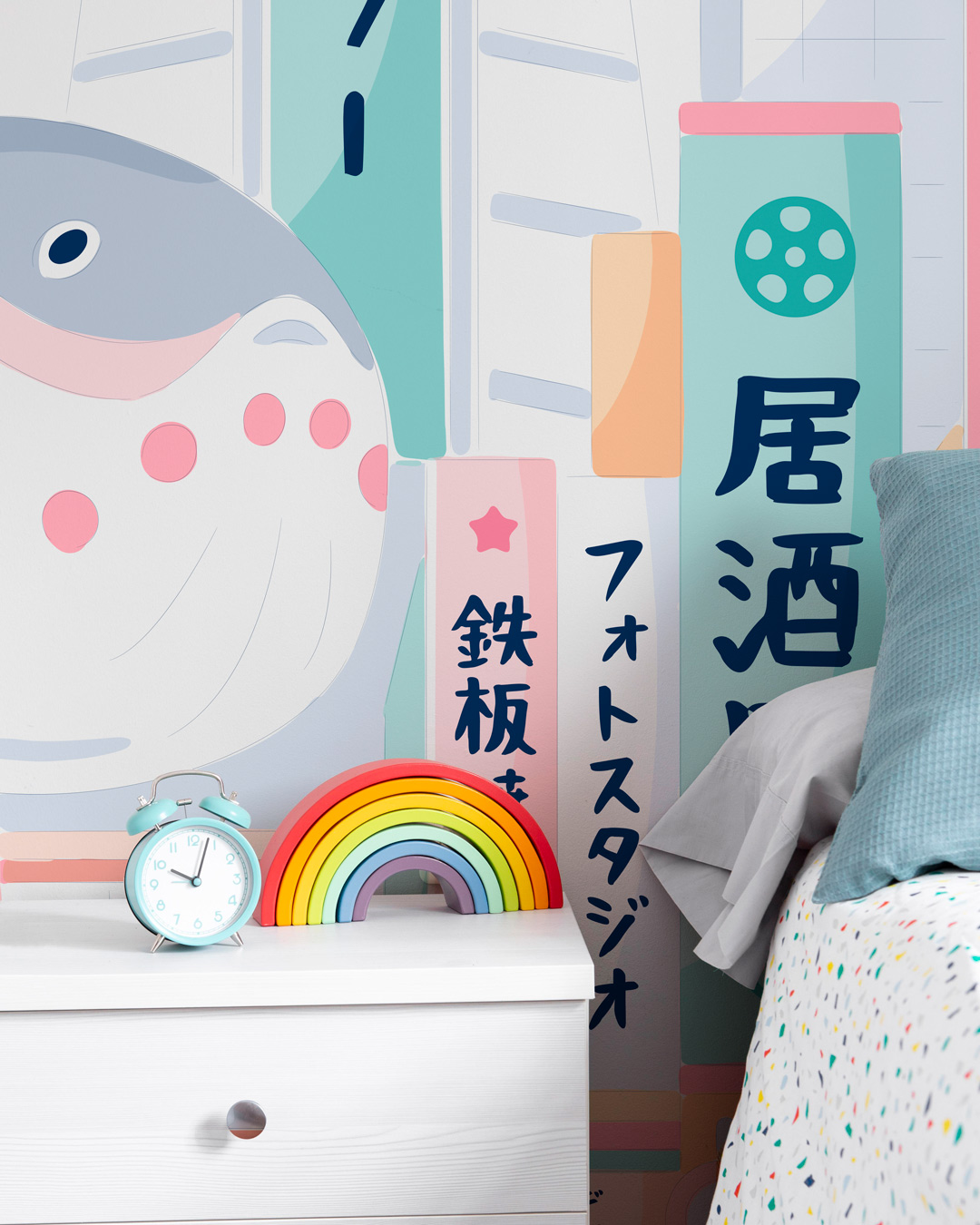 Ce papier peint évoque un Japon urbain et festif, tout en conservant une esthétique douce et enfantine. Le décor s’organise autour de grands panneaux verticaux portant des inscriptions japonaises, dans une palette de couleurs pastel tel que rose poudré, bleu ciel, vert menthe et pêche, qui adoucit l’ensemble. Au centre de la scène, un adorable fugu (poisson-globe japonais) semble flotter dans l’air, ajoutant une touche d’humour et de fantaisie. L’ensemble est traité dans un style illustratif aux formes arrondies, presque cartoon, qui invite au rêve et à l’exploration. Ce visuel riche et dynamique crée un décor immersif sans être envahissant : il capte l’attention tout en laissant place à l’imagination.