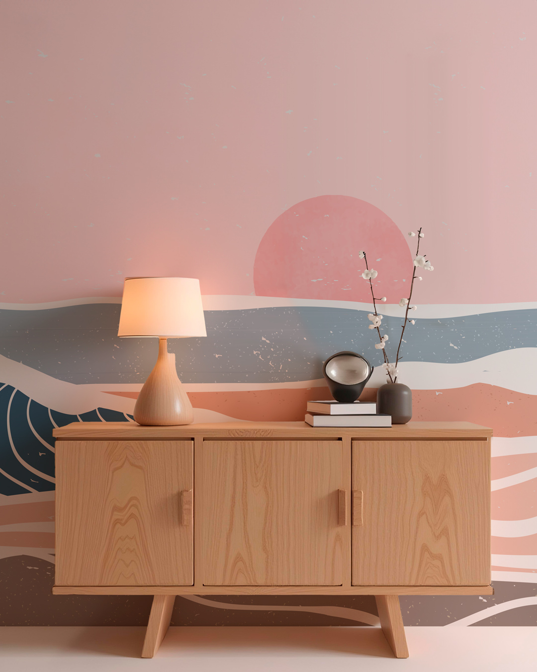 L’un des atouts majeurs de ce papier peint panoramique vague minimaliste est sa grande capacité d’association avec différents matériaux. Voici quelques pistes pour réussir une décoration harmonieuse :