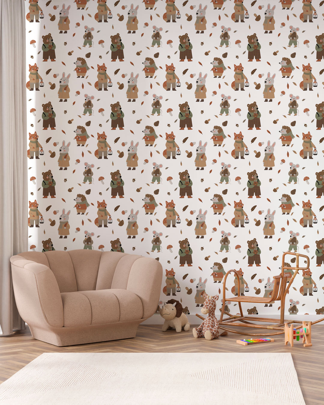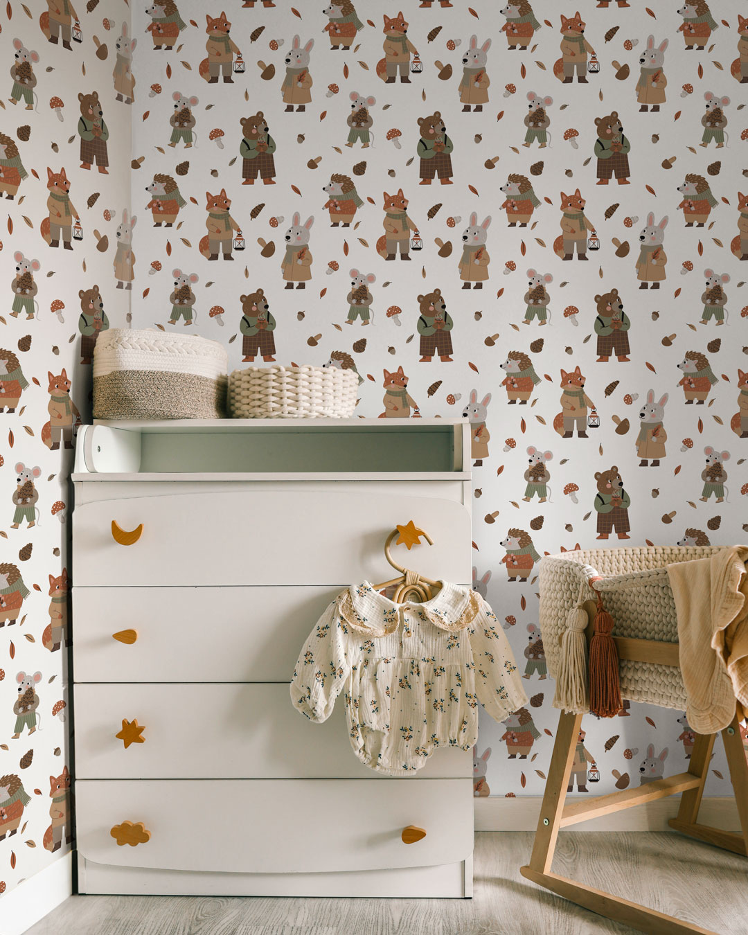 Conçu pour éveiller la curiosité des plus petits, ce papier peint transforme la chambre en un véritable décor de conte. Les animaux semblent raconter une histoire à chaque regard : celle d’une balade en forêt, entre feuilles qui tombent et trésors cachés. C’est un univers rassurant, propice à la rêverie et à la créativité.