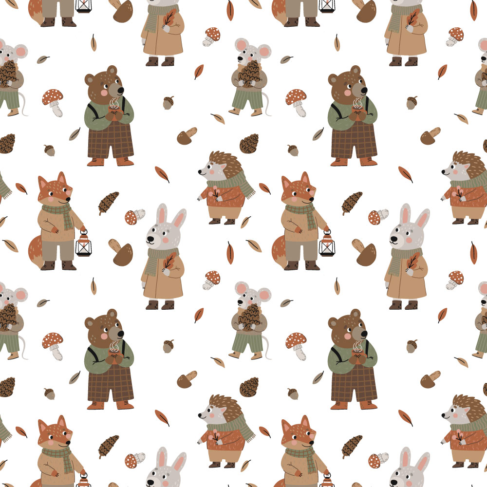 Le papier peint motif animaux de la forêt à l’automne enfant transporte instantanément dans un univers doux et réconfortant. Sur un fond crème ponctué de feuilles rousses et de champignons, de tendres personnages — lapins, renards et ours — se promènent en habits d’explorateurs. Chaque détail évoque la magie de la nature en automne : les tons chauds, les nuances brunes et cuivrées, les textures feutrées des pelages, tout participe à créer une atmosphère pleine de tendresse et d’imaginaire.
