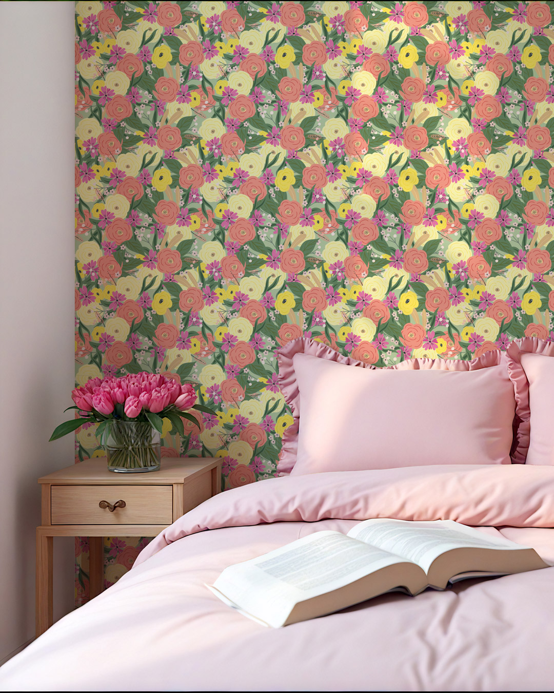 S’il est très ancré dans la tendance actuelle des intérieurs colorés et expressifs, le papier peint fleuri acidulé conserve un charme intemporel grâce à ses motifs floraux universels. Il s’inscrit dans un mouvement déco qui valorise la nature, la joie et la légèreté, tout en restant suffisamment versatile pour s’adapter aux changements de mobilier ou d’ambiance au fil du temps.