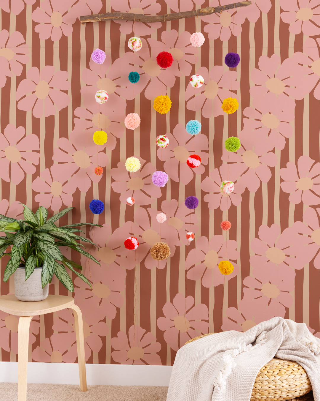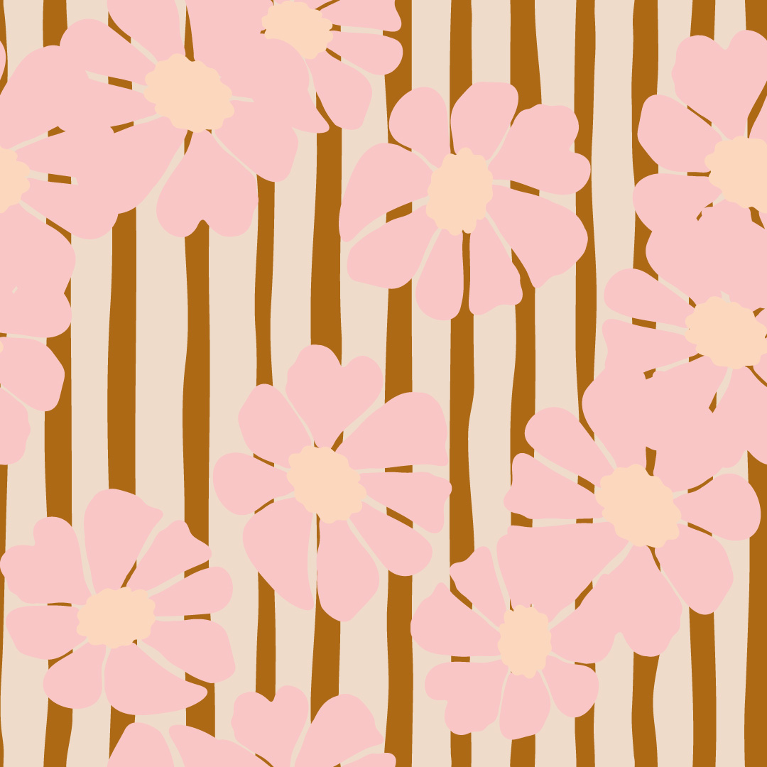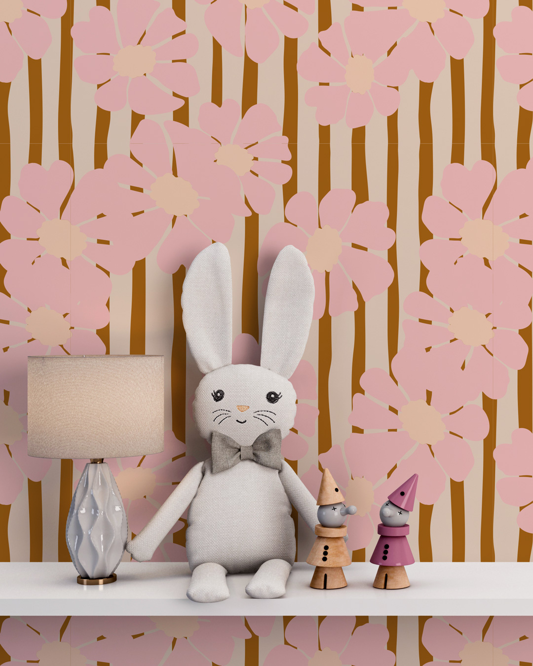 Chaque bande apporte rythme et légèreté, tandis que les fleurs diffusent une sensation de fraîcheur et de légèreté. L’équilibre entre ces deux éléments confère à ce papier peint un caractère à la fois moderne, féminin et intemporel.