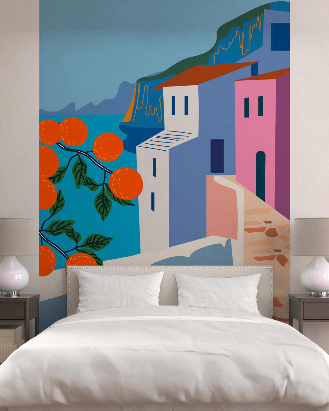 • Du linge de lit aux teintes neutres et claires : blanc, beige, lin naturel ou gris doux, afin de mettre en avant les couleurs vives de la fresque sans alourdir l’ensemble.