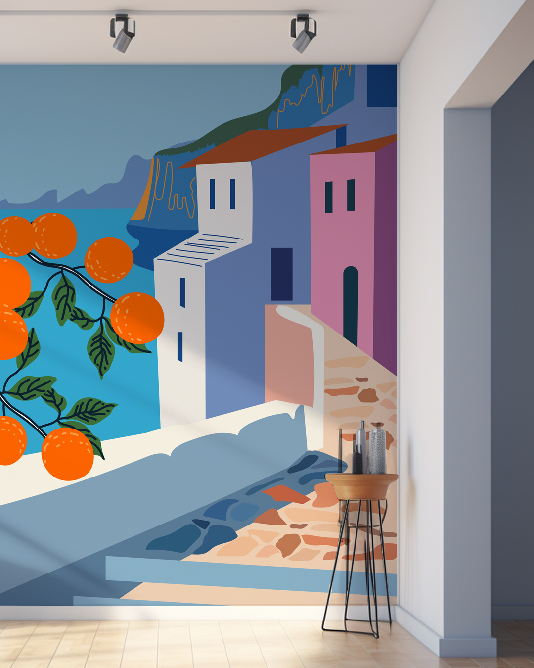 • Un style minimaliste et épuré : évitez de surcharger l’espace. La fresque est suffisamment expressive pour jouer le rôle de pièce maîtresse.