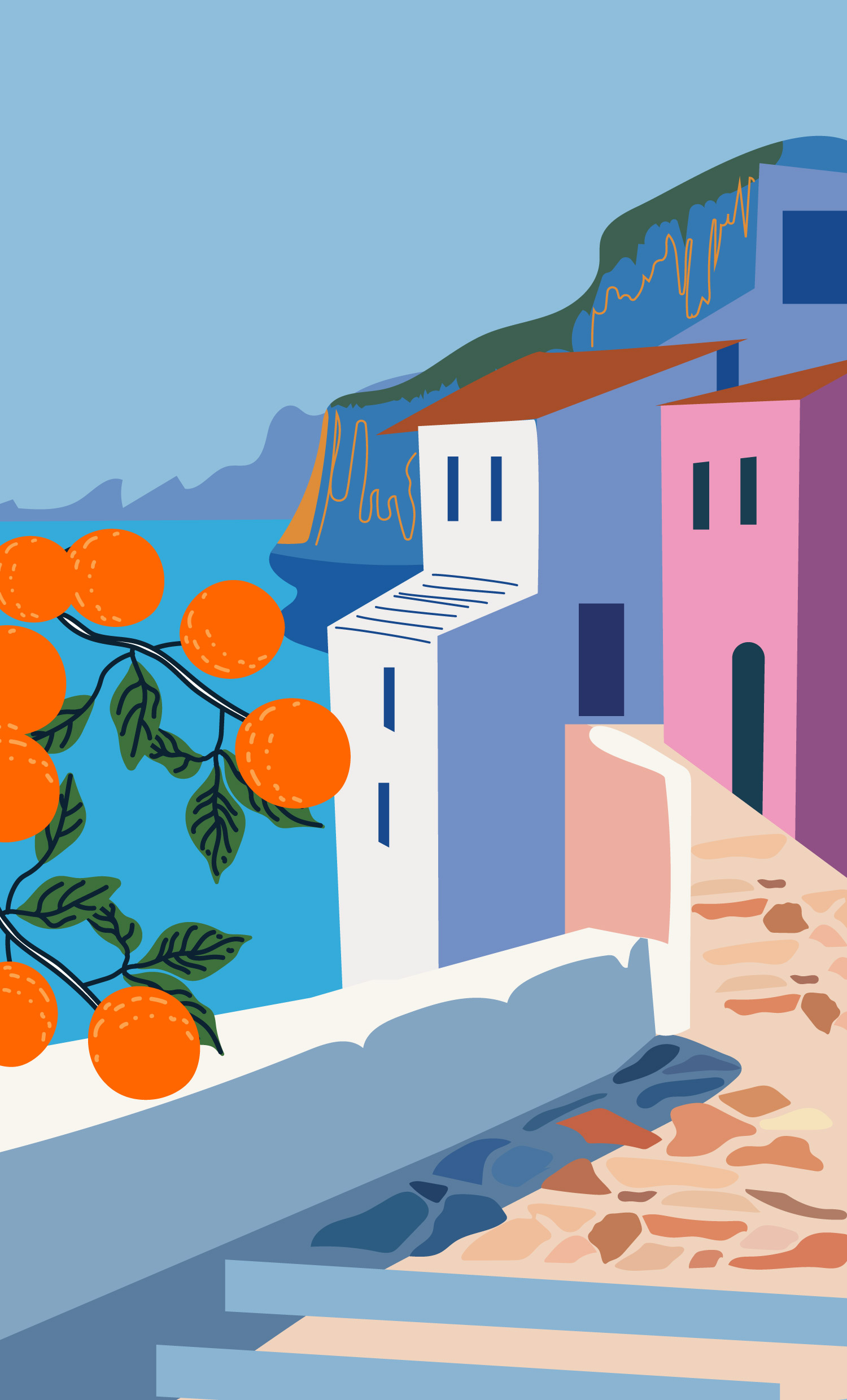 L’association de couleurs franches et lumineuses rappelle les villages pittoresques perchés sur les falaises, où la mer scintille sous le soleil d’été. La branche d’oranger au premier plan donne une impression de fraîcheur et de vitalité.