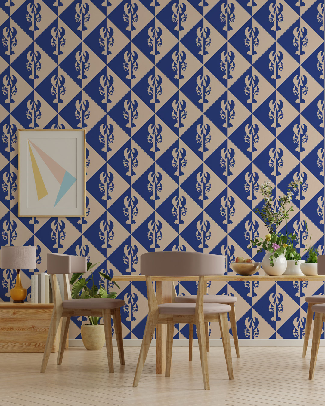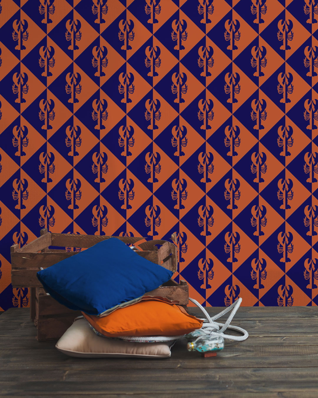 Le papier peint homard réinvente les codes de la décoration murale en mêlant humour, design géométrique et esprit graphique. Avec ses losanges parfaitement ordonnés et ses homards stylisés, il attire immédiatement le regard et insuffle à la pièce une énergie à la fois vintage et décalée.