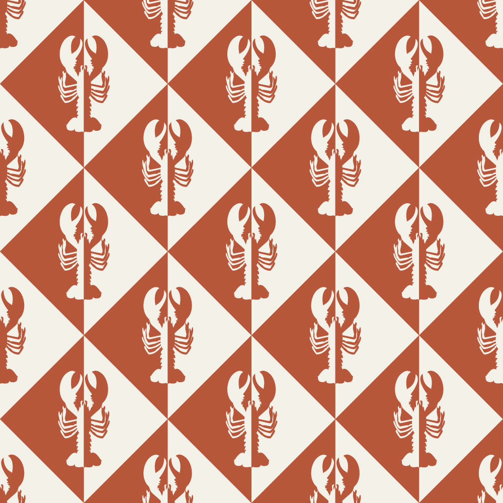 Le papier peint homard repose sur un motif répétitif de losanges rouges orangés contrastant avec un fond crème doux. Cette structure géométrique parfaitement équilibrée donne une impression d’ordre et d’harmonie, tout en laissant s’exprimer la fantaisie du motif central : un homard minimaliste, traité de manière presque graphique.
